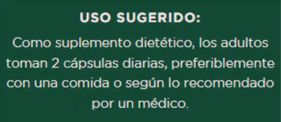 Toma 2 cápsulas al día, con o sin comida. Para obtener mejores resultados, úsalo de forma constante.